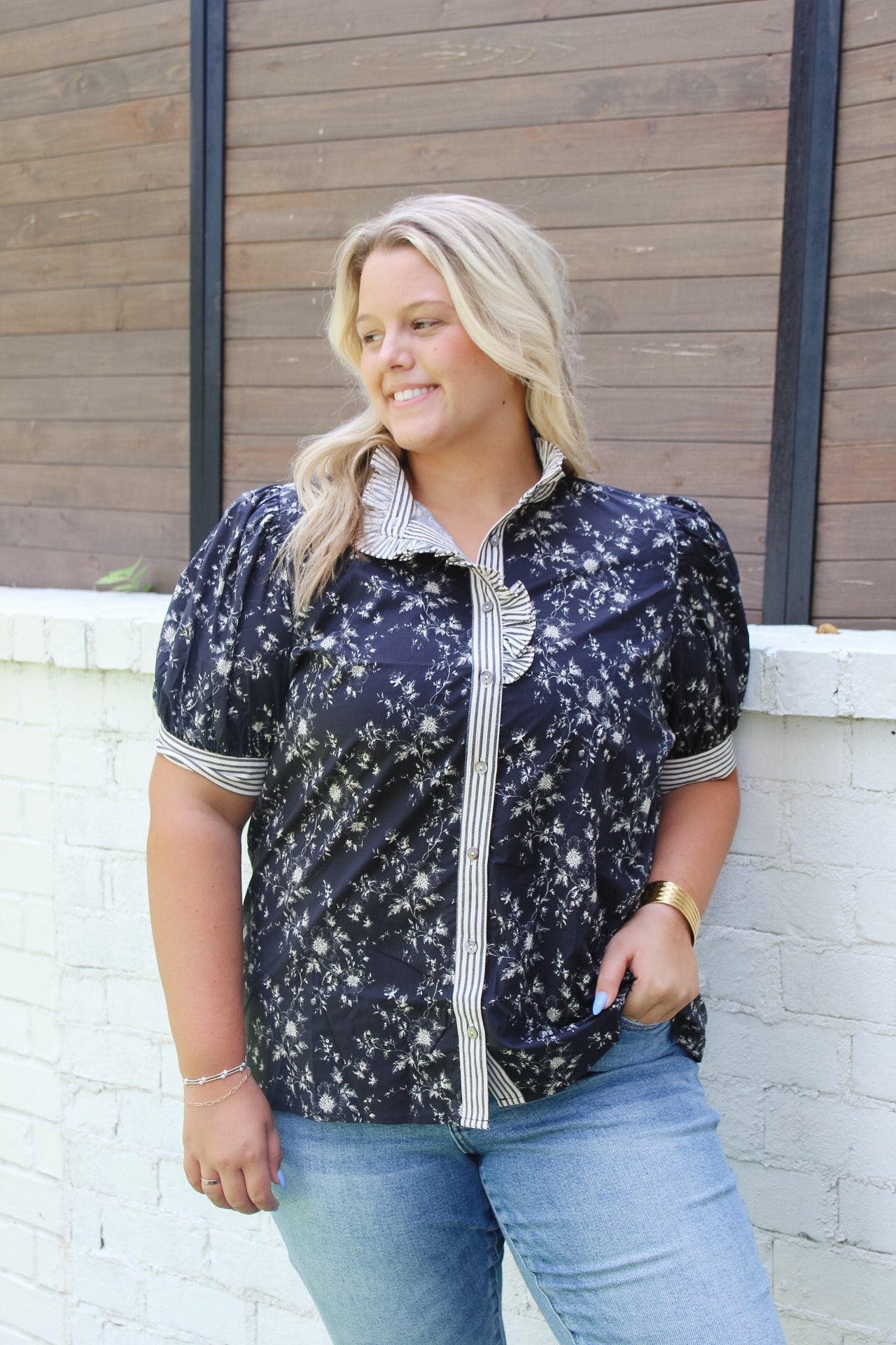 - Floral print puff shoulder short sleeve top featuring striped contrast accent ruffle neck band. Button front closure.