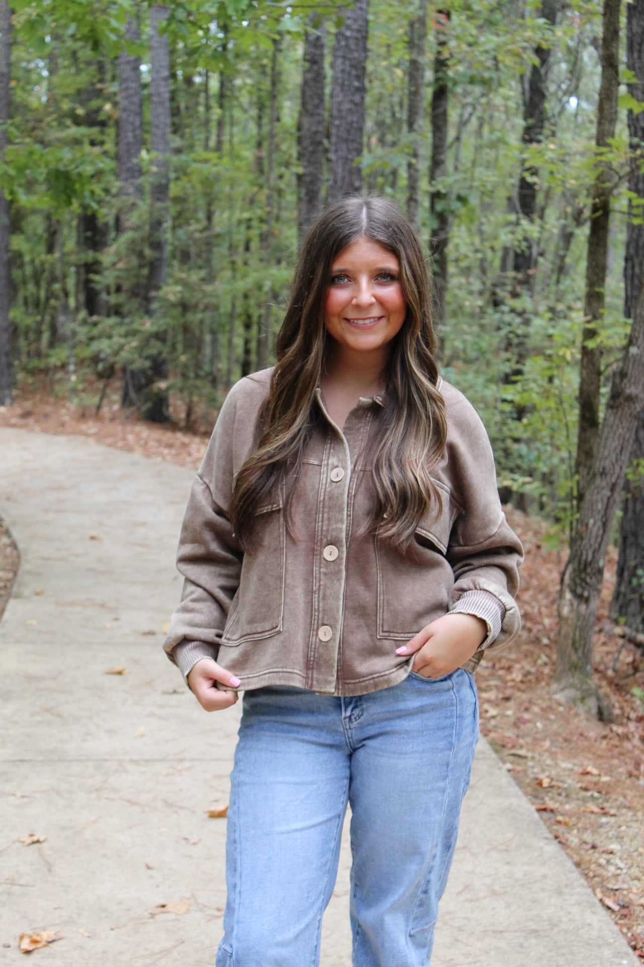 • Acid wash fleece front pocket cropped shacket