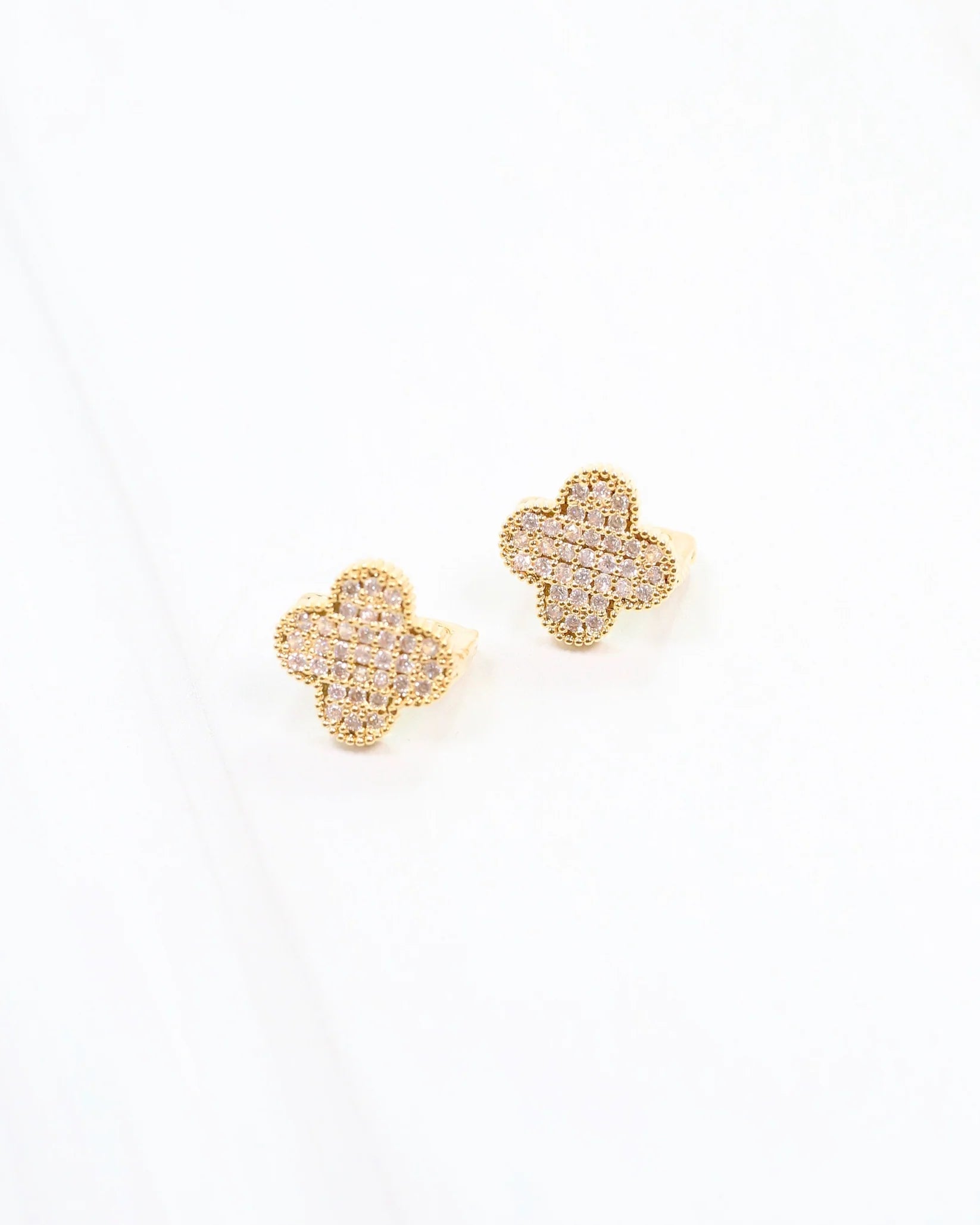 Indulge in luxury with the Mathison Clover Stud Gold earrings. These stunning studs feature a pave clover design with a textured edge for added dimension and style. The latch back closure ensures a secure fit. Crafted from brass and gold dipped with sparkling CZ pave stones, these earrings exude sophistication and exclusivity.
