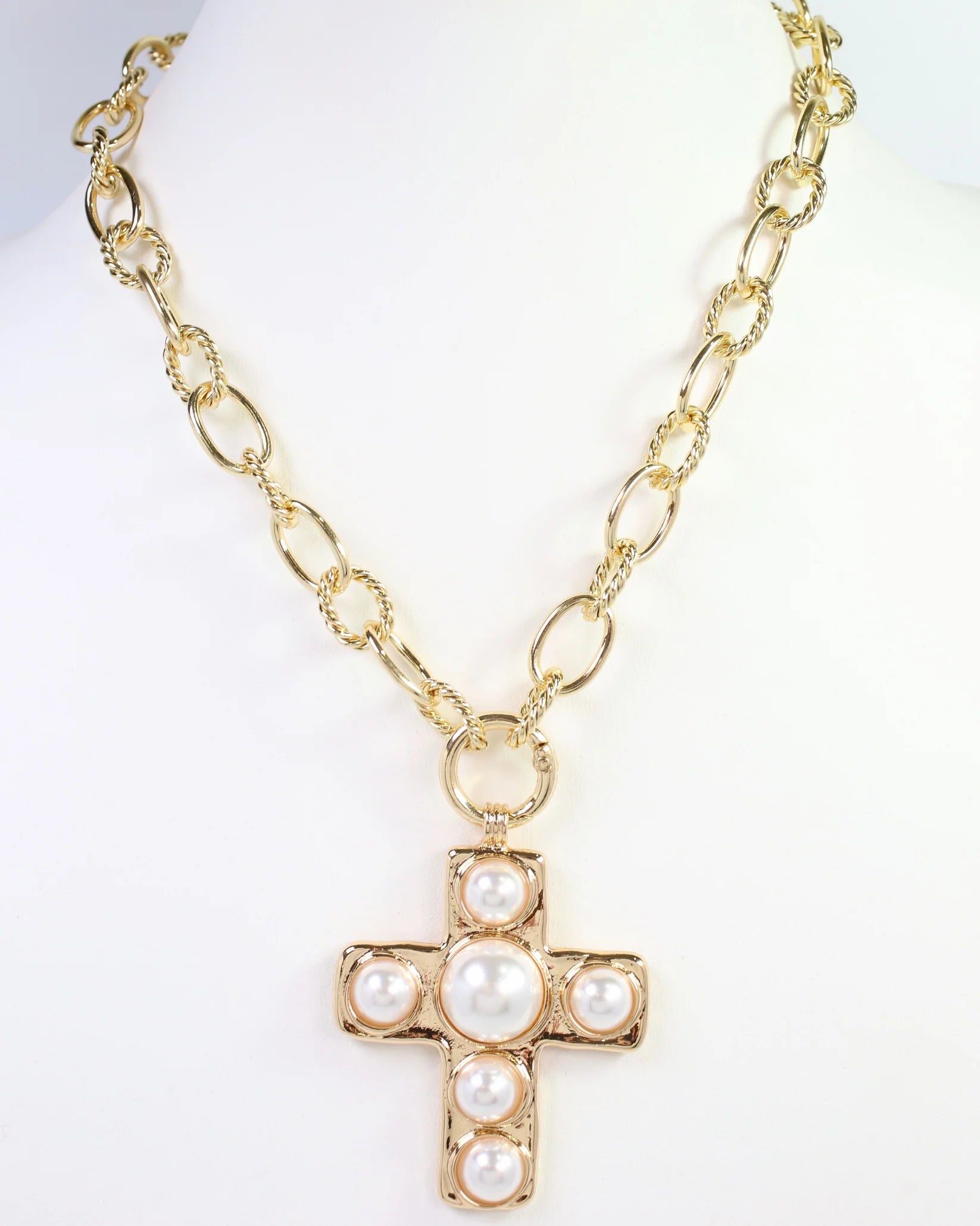 Make a bold fashion statement with the Nampa Cross Pendant Necklace in Gold. Featuring a stylish cross charm detailed with delicate pearl inlay, this necklace combines timeless elegance with contemporary design. It’s the perfect accessory to enhance any outfit with a chic, sophisticated edge.
