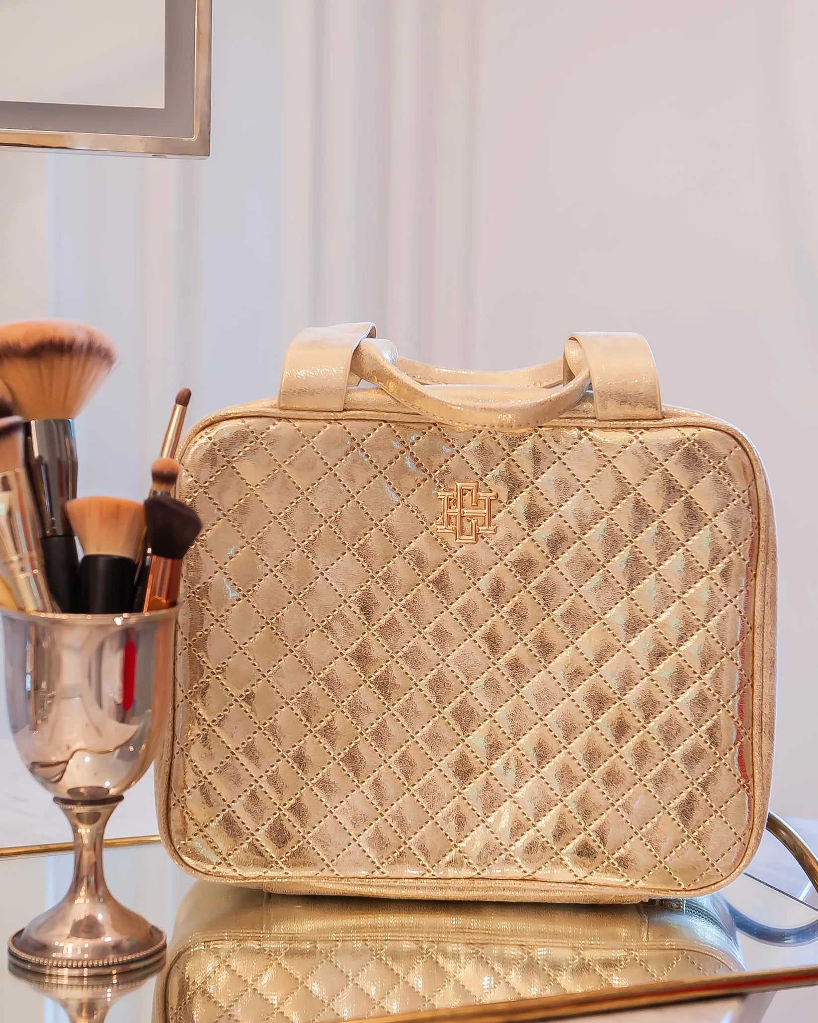 This large case is the ultimate makeup and travel piece. It features a quilted vegan patent leather fabric and two top carrying handles. The three sided zipper allows the case to unfold and lay completely flat, and the interior is lined with a hot pink fabric with a clear protective material. For ultimate organization, this case has four clear removable pouches that are attached to the interior with velcro. Each removable case has a zipper closure. The possibilities are endless when it comes to what this case can carry- cosmetics, toiletries, chargers, and more.