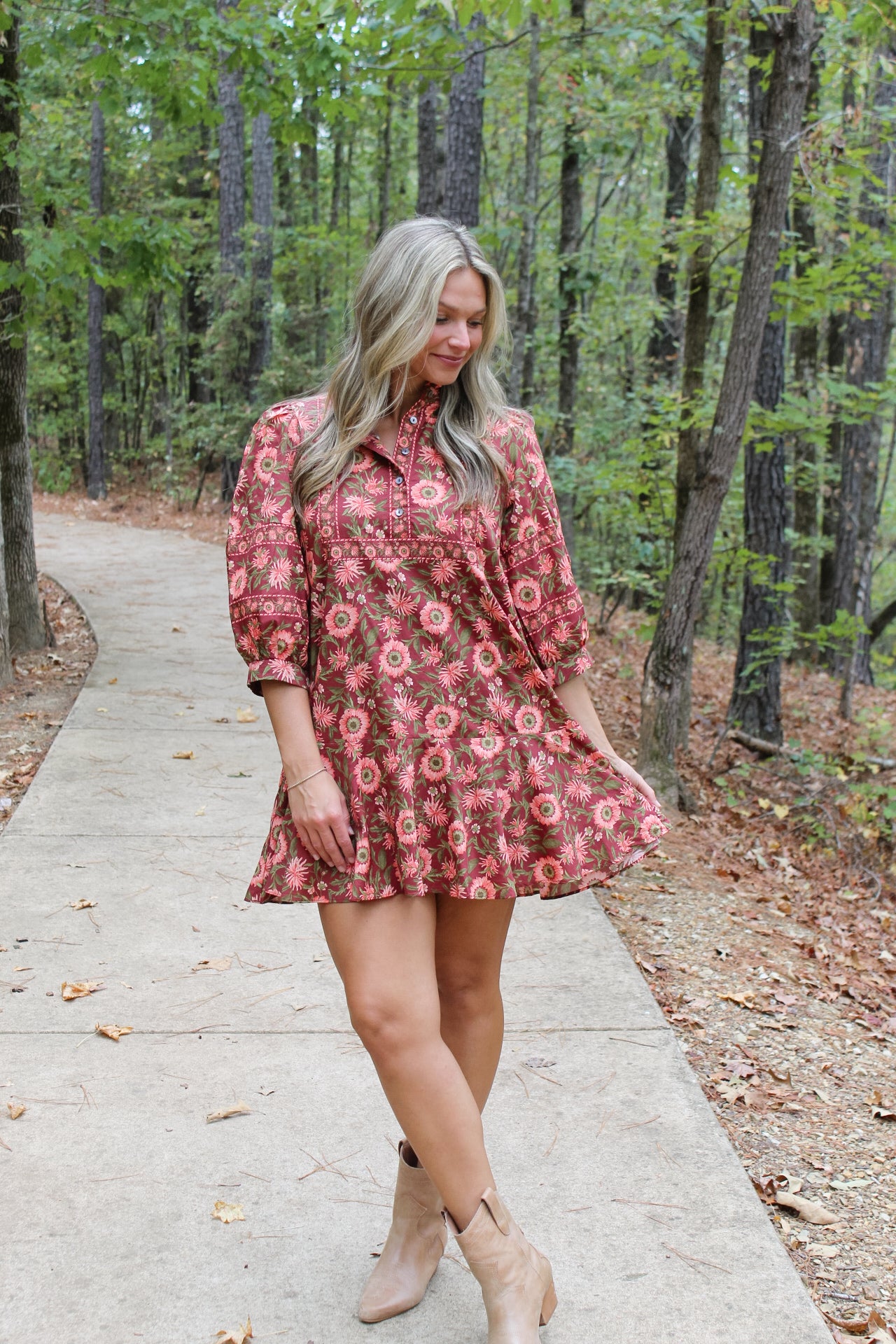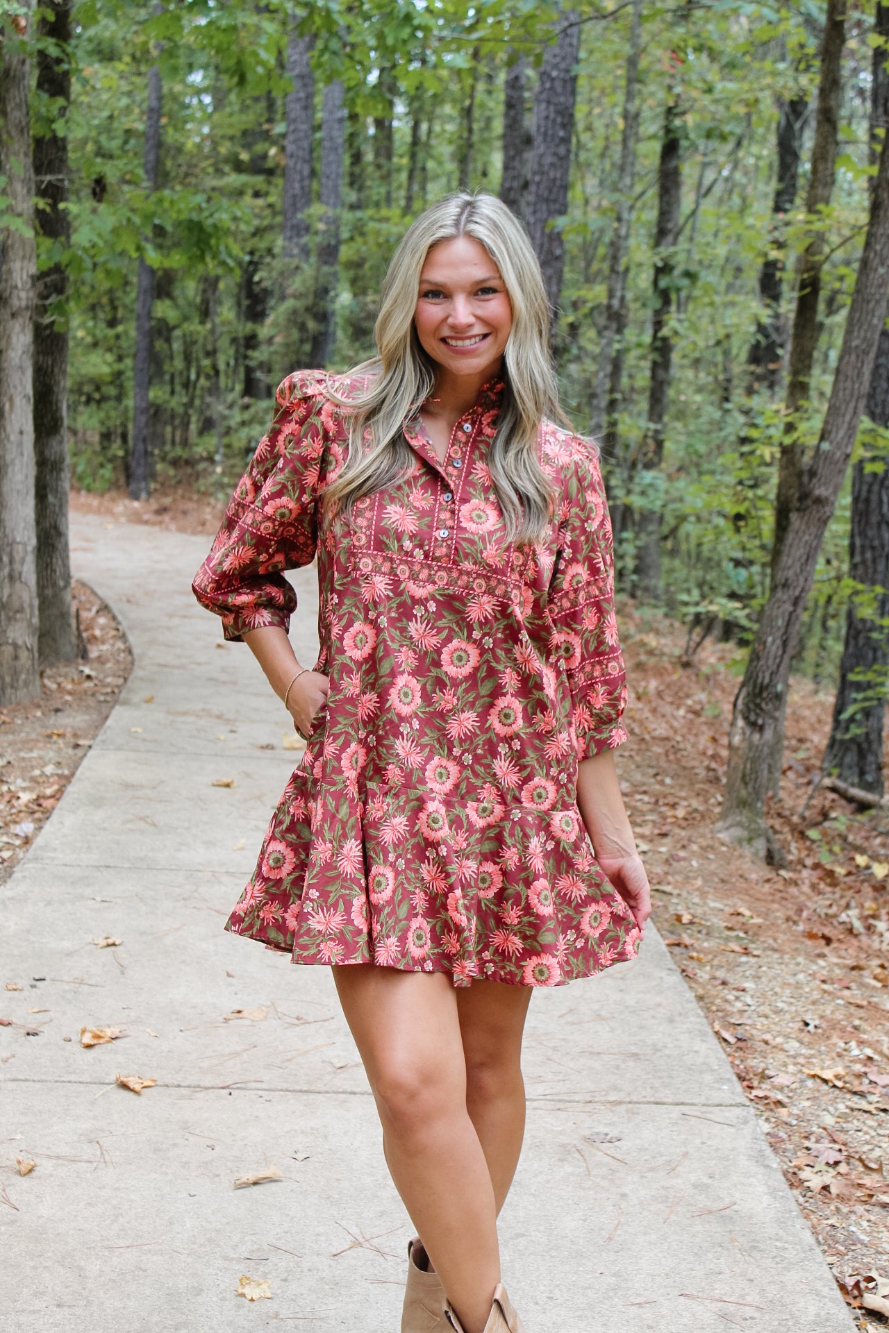 - Floral print puff 3/4 sleeve mini dress featuring ruffled neck band collar and partial button closure at front.