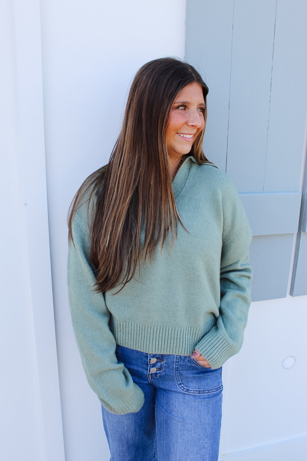 - This relaxed-fit knit sweater features an open V-neckline with a soft, laid-back collar for a polished yet casual feel.